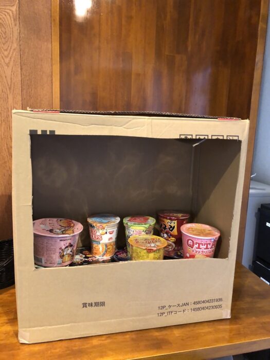 中はさまざまなカップ麺!くり抜いてある箱も、なんだかワクワク感がありませんか?!
